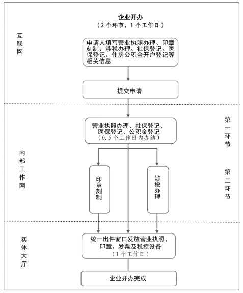 再造企业开办流程,实现新开办企业营业执照申领、社保登记、医保登记、住房公积金开户登记、印章刻制、涉税办理相关信息一表填报,同步启动银行开户在线预约;将企业开办合并为营业执照申领、社保登记、医保登记、住房公积金登记和印章刻制、涉税办理2个环节,全程网办,1个工作日内办结,办理结果及时反馈;政府免费为新开办企业提供一套印章(公章、财务章、发票专用章、法定代表人名章四枚)、发票及税控设备,并根据不同类型提供相应“政策包”。