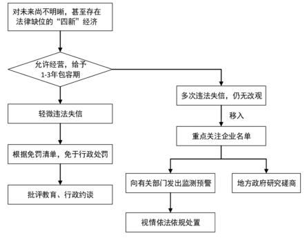 一是完善新兴业态监管模式。对共享经济、人工智能、工业互联网等新技术、新产业、新业态、新模式,量身定制监管制度,在守住安全底线的前提下,给予企业1-3年包容期。二是推行柔性监管方式,建立轻微违法行为免罚清单。在包容期内,以行政指导和服务为重点,通过法规宣传、行政提示、行政建议、行政约谈等柔性监管方式,积极引导和督促企业守法诚信经营。允许企业试错,对非主观故意、没有造成危害后果的首次轻微违法行为,指导企业自觉改正,一般不予行政处罚。三是建立轻微或一般违法失信积累关注机制。对市场主体在短期内反复出现的多次违法失信行为,及时提醒约谈;经提醒仍无改观的,移入重点关注企业名单,向有关部门发出监管风险预警。四是建立集体会商制度。相关部门牵头邀请法律专家、“四新”经济专业人士、企业家参与,定期研究磋商“四新”经济监管政策,及时制定个性化监管方案,为其发展提供充足的空间。五是划定监管红线,对P2P网贷、私募股权融资等领域,以创新之名行侵权欺诈之实的伪新兴项目,依法严惩,绝不姑息。