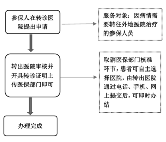 3.简化转诊转院备案报销流程。对因病情治疗需要转往外地就诊住院治疗的参保人员,直接由当地转出医院办理手续,不再经医保部门核准,参保群众可在转入的省、市所有联网结算医院中自主选择就医,取消过去固定1家转诊医院的要求;同时,需多次转诊治疗的,办理一次转诊手续后,一年内有效,进一步方便患者就医报销。