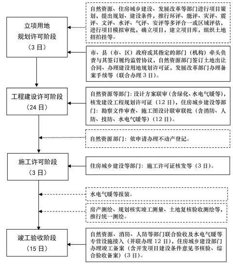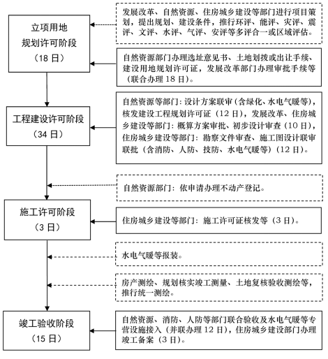 注: 1. 图中虚线部分表示由政府部门、单位提前介入事项或企业申报, 有关部门、单位并行办理,但不计入主流程审批(审查)时间的事项。建设单位按要求整改时间,不计入审批时间。