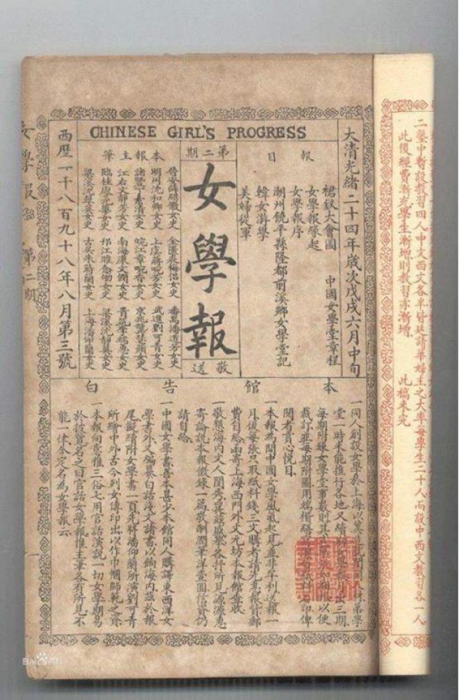 (《女学报》是中国第一份妇女报刊。1898年7月24日创刊于上海,由中国女学会主办,主笔为康有为的女儿康同薇、梁启超的夫人李蕙仙等)