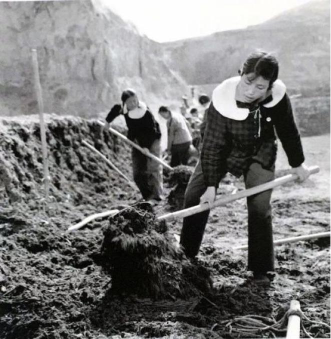 (20世纪70年代初,山西昔阳郭凤莲带领“铁姑娘队”在大寨挖土垫地)