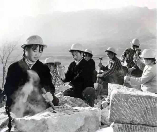 (20世纪60年代,河南林县人民自力更生,在太行山悬崖峭壁上修建长达1500公里的红旗渠。图为工地上工作的妇女)