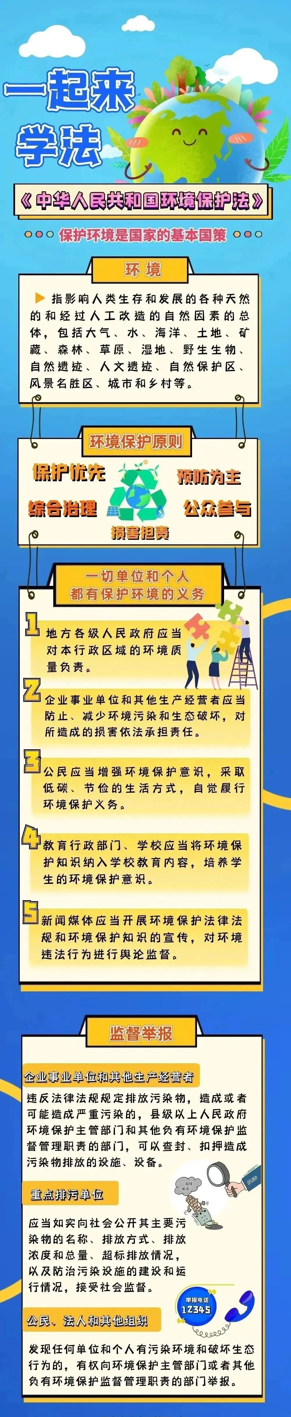 《中华人民共和国环境保护法》是一部为保护和改善环境,防治污染和其他公害,保障公众健康,推进生态文明建设,促进经济社会可持续发展而制定的国家法律。新修订的《中华人民共和国环境保护法》2015年1月1日起施行,这是我国生态环境领域的“基本法”,也是“史上最严的环保法”。
