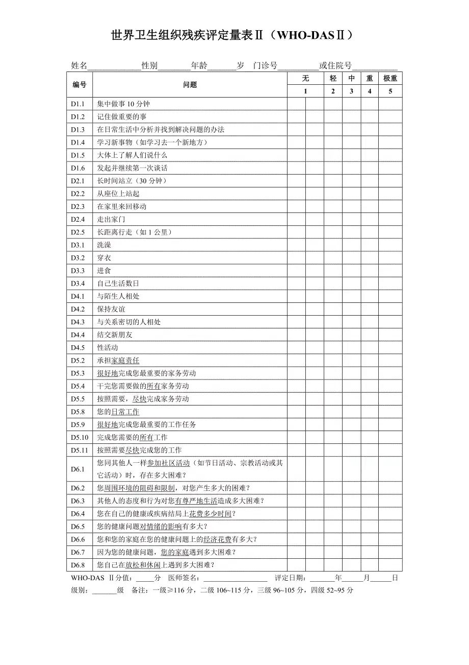 开发背景:由世界卫生组织(WHO)和美国国立卫生研究院(NIH)关于残疾评定与分类的合作项目为框架开发,用于评估个体在身体、心理和社会功能方面的残疾程度。