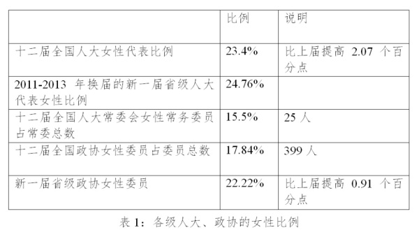 妇女享有平等参与国家和社会事务管理的机会。十二届全国人大女性代表比例比上届提高2.07个百分点,达到23.4%;十二届全国人大常委会现有女性委员25人,占委员总数的15.5%。十二届全国政协有女性委员399人,占委员总数的17.84%。2011-2013年换届的新一届省级人大代表女性比例达到24.76%;新一届省级政协委员中女性比例达到22.22%。2015年省级政府领导班子配备女性干部比例比2012年有明显提升。2014年,在企业董事会、监事会中,女职工董事、监事占职工董事和监事的比例分别为40.1%和41.5%。