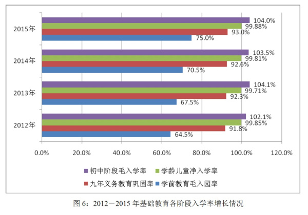 中西部地区教育快速发展。中央安排100亿元支持24个中西部省区(包括新疆生产建设兵团)100所左右地方高校基础能力建设。安排56亿元支持没有教育部所属高校的13个省(区)和新疆生产建设兵团各建设1所地方高水平大学。实施“对口支援中西部地区招生协作计划”,教育资源充裕的地区将部分招生指标投向中西部录取率较低地区和人口大省;2012-2015年,协作计划共落实招生指标75.5万人,高考录取率的省际差距逐年缩小。