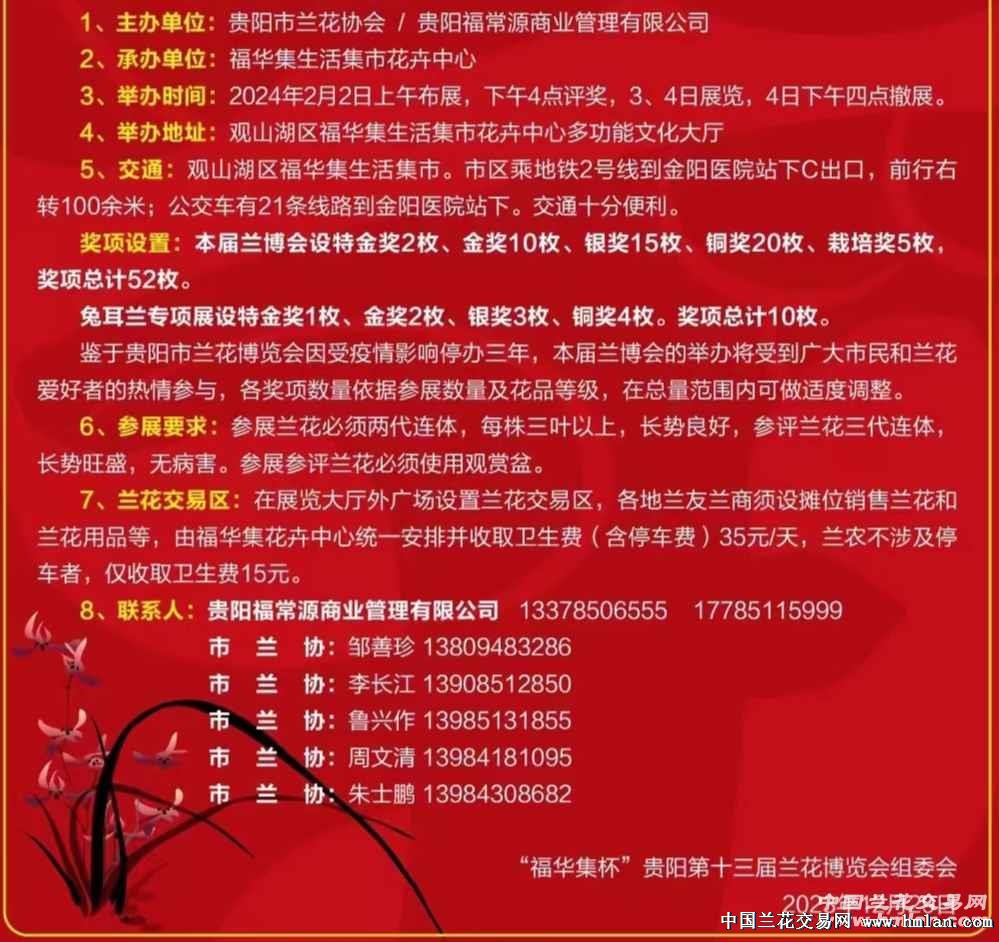 【八】  2024年2月2日-4日,贵州省贵阳第十三届“福华集杯”兰花博览会,将在贵阳市观山湖区福华集生活集市花卉中心举行,并设60余项大奖,奖金可观。联系人:邹善珍 13809483286