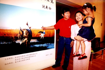 宝群(左)如是说。此次由齐齐哈尔鹤艺文化有限公司、北京君子策文化传播有限公司举办的影展展示了作者20年来摄取到的丹顶鹤动人的仙姿与倩影。