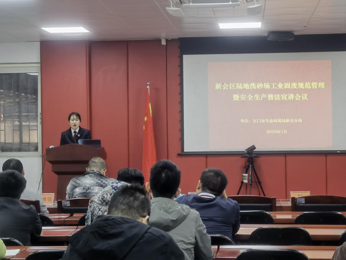 为进一步规范陆地洗砂场工业固体废物管理工作,提升全区工业固废规范化管理水平,筑牢岁末年初工业固废领域环境安全防线,近日,江门市生态环境局新会分局联合新会区检察院召开陆地洗砂场工业固废规范管理暨安全生产普法宣讲会议,指导帮扶洗砂洗泥企业解决污染防治难题。新会区18家涉洗砂洗泥企业代表和相关镇(街)生态环境工作业务骨干参加此次培训会议。