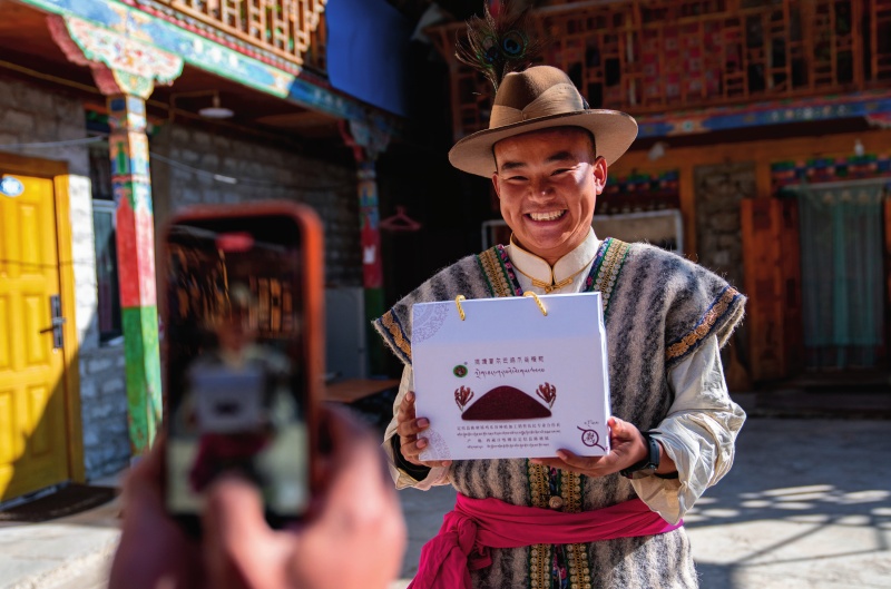 在西藏日喀则市定结县陈塘镇,自媒体博主夏尔巴人旦增在拍摄视频推介当地特产鸡爪谷糌粑(2024 年 12 月 13 日摄)丁增尼达摄 / 本刊