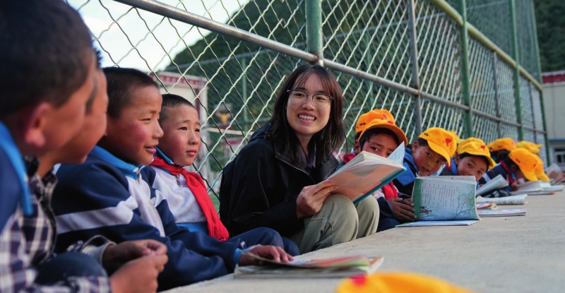 在西藏林芝市工布江达县娘蒲乡中心小学,岭南师范学院支教队队员涂建枝在晚自习前和孩子们一起温习功课(2024 年 9 月 3 日摄) 刘洲鹏摄 / 本刊