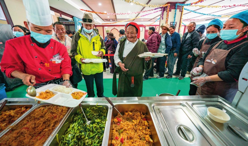 在西藏那曲市色尼区老年人日间照料中心,老人们在排队打饭(2025 年 4 月 25 日摄)丁增尼达摄 / 本刊