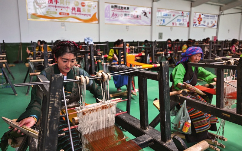 在西藏日喀则市仁布县特色产业孵化园,亚德细褐羊毛织品农民专业合作社工作人员在车间里织布(2024 年 9 月 1 日摄)孙瑞博摄 / 本刊