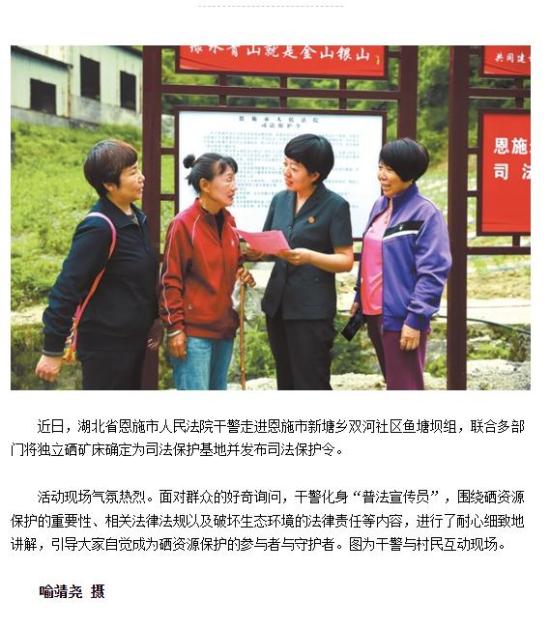 6月12日《人民法院报》纸质版及公众号刊发恩施市法院发布硒矿床保护令