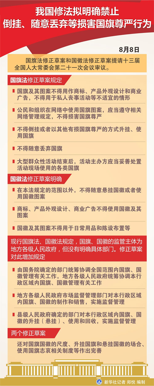 新华社北京8月8日电 题:如何加强维护国旗、国徽的尊严?——聚焦国旗法国徽法修正草案五大看点
