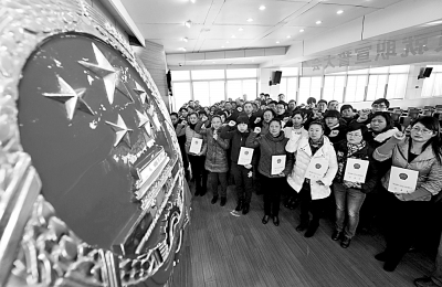 安徽省合肥市瑶海区人民法院人民陪审员面向国徽宣誓。光明图片/视觉中国