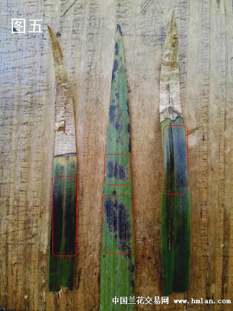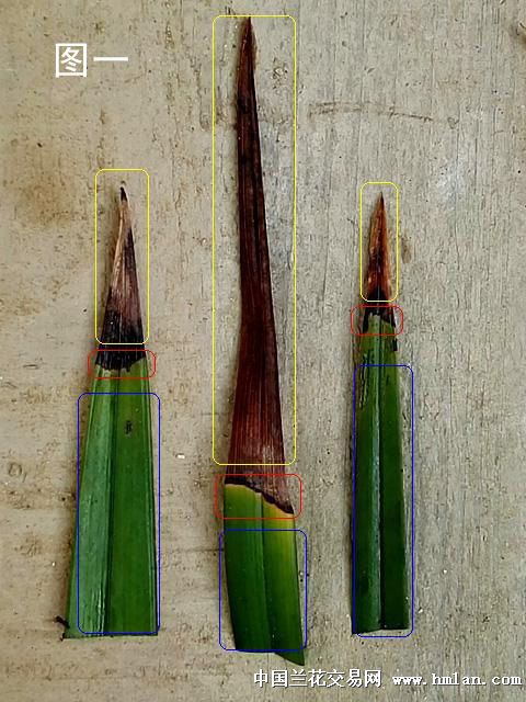 一、缺水。这种焦尖从形态上看,焦尖部份颜色深浅基本一致(见图一黄色圈标记),焦尖与正常兰叶交界线平直,且分界明显(见图一红色圈标记),正常兰叶上不会有其他斑点(见图一蓝色圈标记)。如果连续多年有缺水焦尖有情况,在焦尖部位能见到每年焦尖时留下的平直分界线(见图二红色圈标记)。这种焦尖是由于兰草体内生长水过少(生理性缺水)造成的,也是兰草焦尖的最主要的原因。生理性缺水主要原因也有三种。一是浇水太少,兰草吸不到足够的水份。二是浇水过多,使兰草闷根,影响兰草吸水。三是兰盆内水份浓度过高,影响兰草了吸水。如浓肥浓药,植料中可溶性盐过多使盆内水份浓度过高。