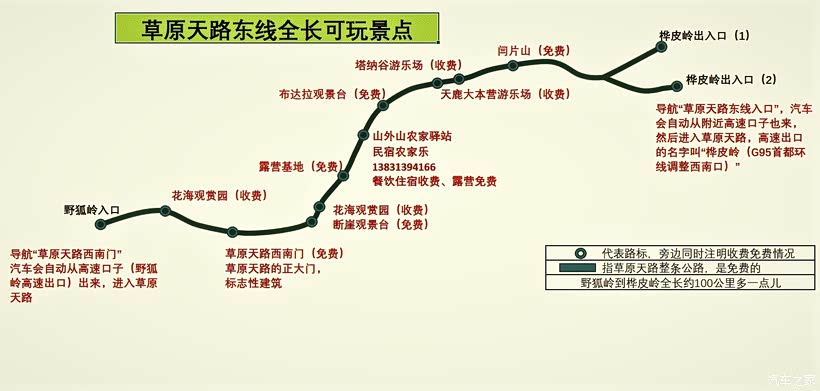 需要注意的是野狐岭入口为100公里路标,桦皮岭入口为0公里路标,东线全长约100公里