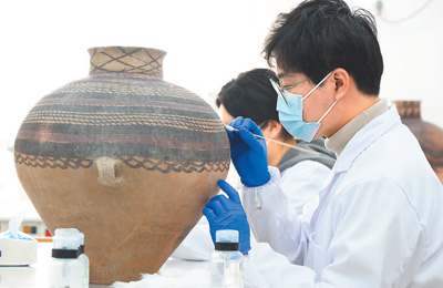 2024年11月,在中国文化遗产研究院陶瓷金属文物修复室内,专业技术人员在对从意大利回归祖国怀抱的彩陶文物进行修复。
