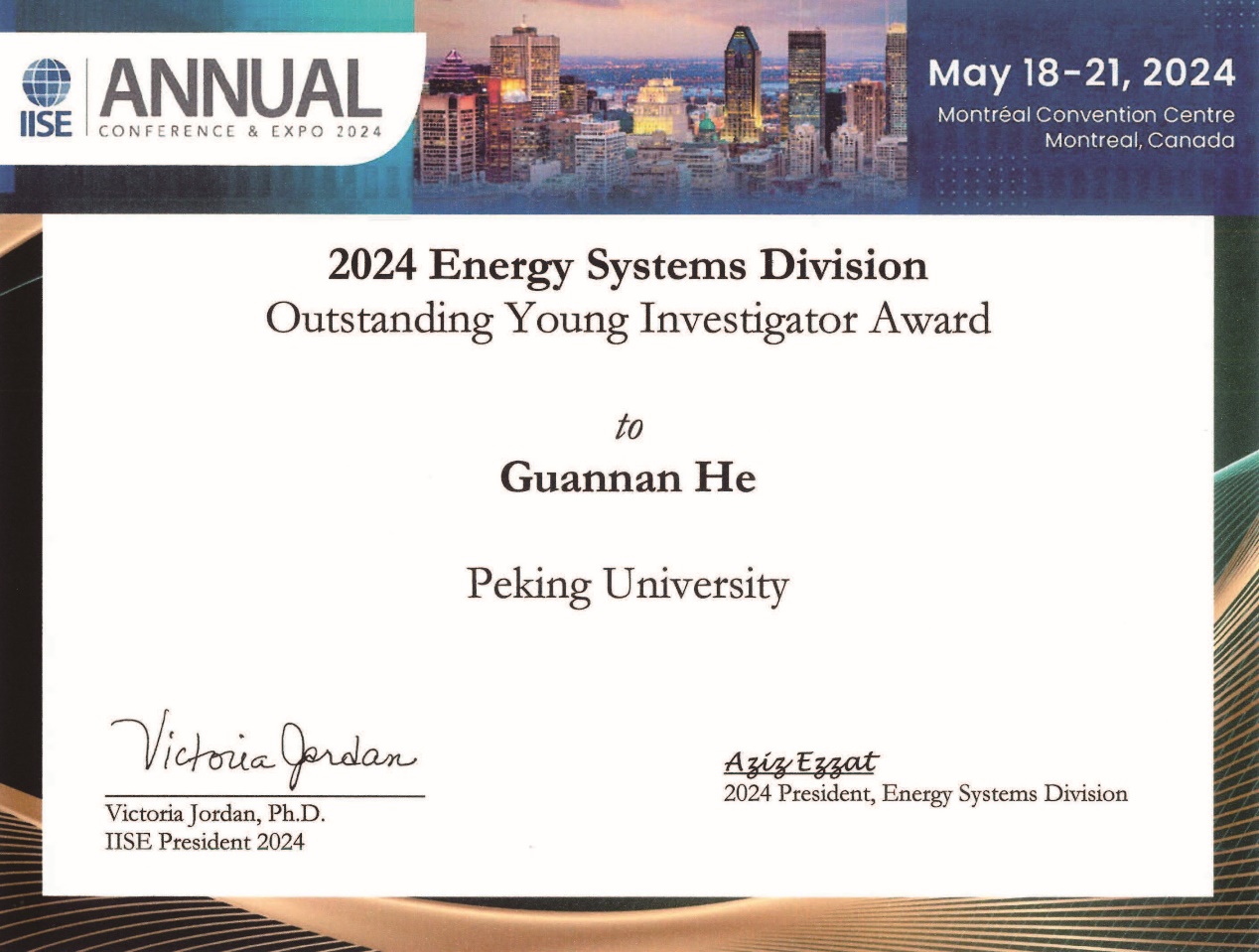 2024年5月18—21日,国际工业与系统工程学会年会(IISEAnnualConferenceandExpo2024)在加拿大蒙特利尔举行。北京大学工学院工业工程与管理系助理教授何冠楠荣获2024年国际工业与系统工程学会能源系统杰出青年科学家奖(IISEEnergySystemDivisionOutstandingYoungInvestigatorAward),以表彰其在能源系统领域的突出贡献。这是该奖项设立以来首次颁发给在国内工作的学者。国际工业与系统工程学会(Instit...