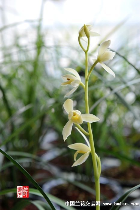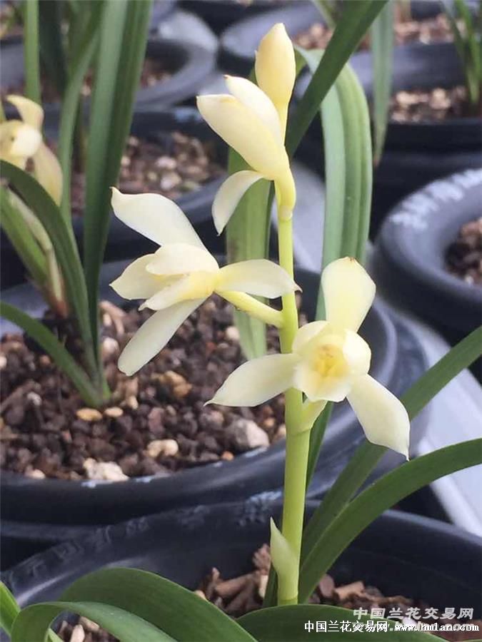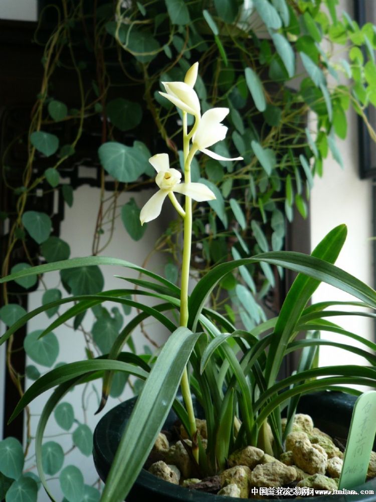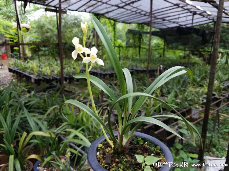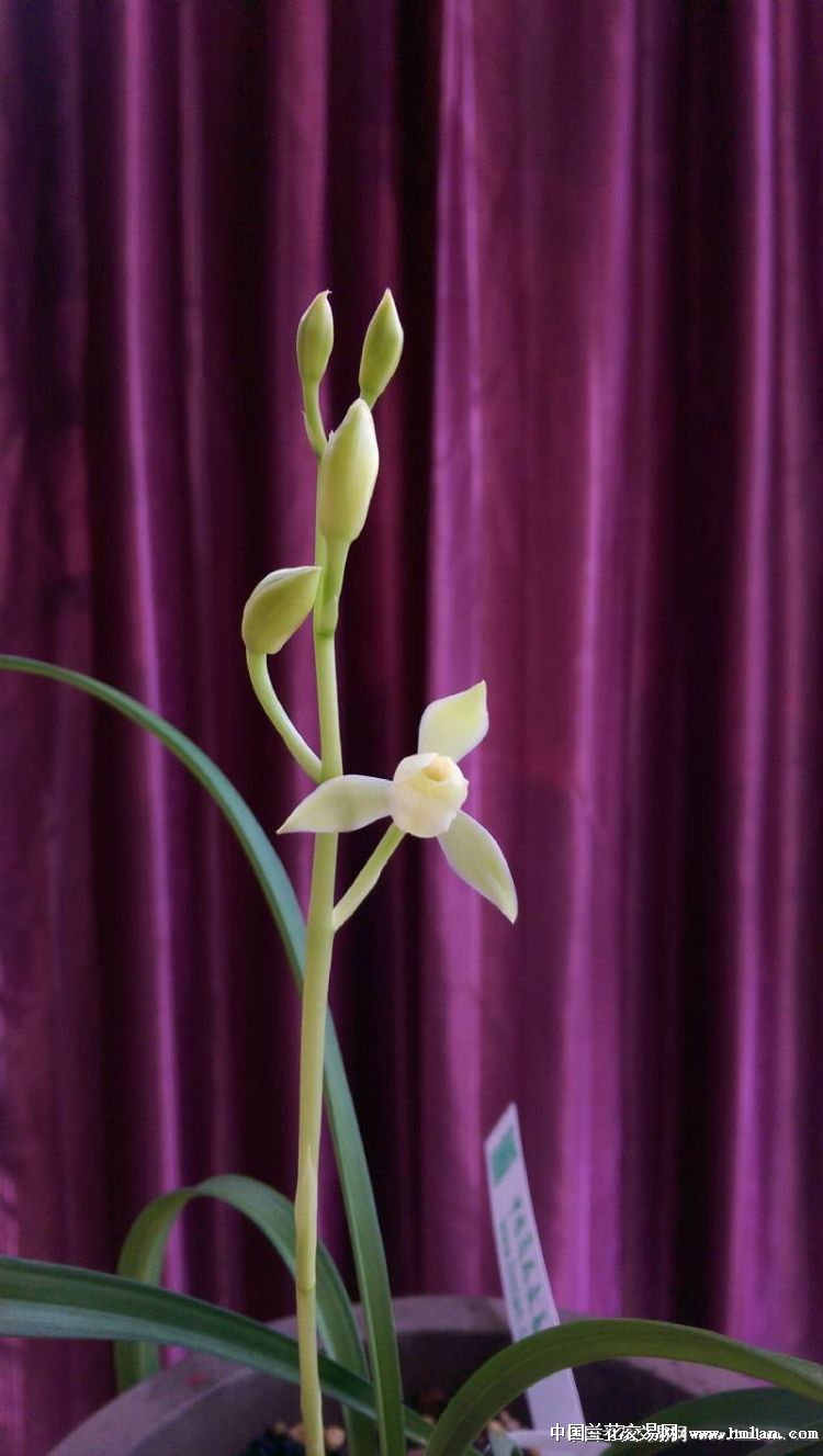 “丹霞白素荷”为数年前福建知名兰商许宗全购于广东韶关资深兰家黄小平处。当时也是一组山采四季的好叶型素芽赌草,许宗全购回后栽培开花命名并推广。丹霞白素荷叶材中矮,叶苍劲有力,花开奶白色正格荷型水仙瓣、蚌壳捧、刘海舌、五瓣分窠、小草大花、花大出架,花开半月花容不变,体态端庄、雍容华贵气度非凡,宛如一份精雕细琢的活艺术品。由于推出时值四季兰行情低谷,故关注、栽培不受重视,数量到目前为止也是为数不多,只是零星的散布在全国爱好者手里,没有规模化的种养大户,但可喜的该品种已发现有芽变连代初级线艺兰株,如能线艺往更高级的方向进化,艺又上花,那可真是锦上添花,大放异彩。近年来,四季兰市场春意盎然,主流品种川产极品色花峨眉晨光、国魂闻名天下,独占鳌头。而南方四季品种更是有天赐异草大唐宫粉,美玉天成般的丹霞白素荷,群雄逐鹿,比翼同晖!