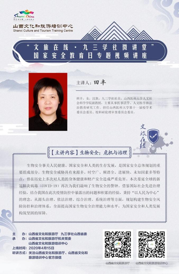 全民国家安全教育日来临之际,山西省文化和旅游厅、九三学社山西省委主办,山西省文化和旅游厅机关党委、山西省文化和旅游培训中心承办的“文旅在线·九三微讲堂”特邀田丰老师作为主讲嘉宾,线上推出《生物安全:危机与治理》,从当下疫情看生物安全的危害及防控治理,提升全民对生物安全的重视高度。