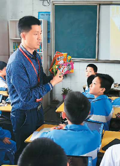 4月23日,江西省新余市分宜县的执法人员在分宜县第一小学向学生讲解盗版书籍的鉴别方法。周亮 摄(人民视觉)