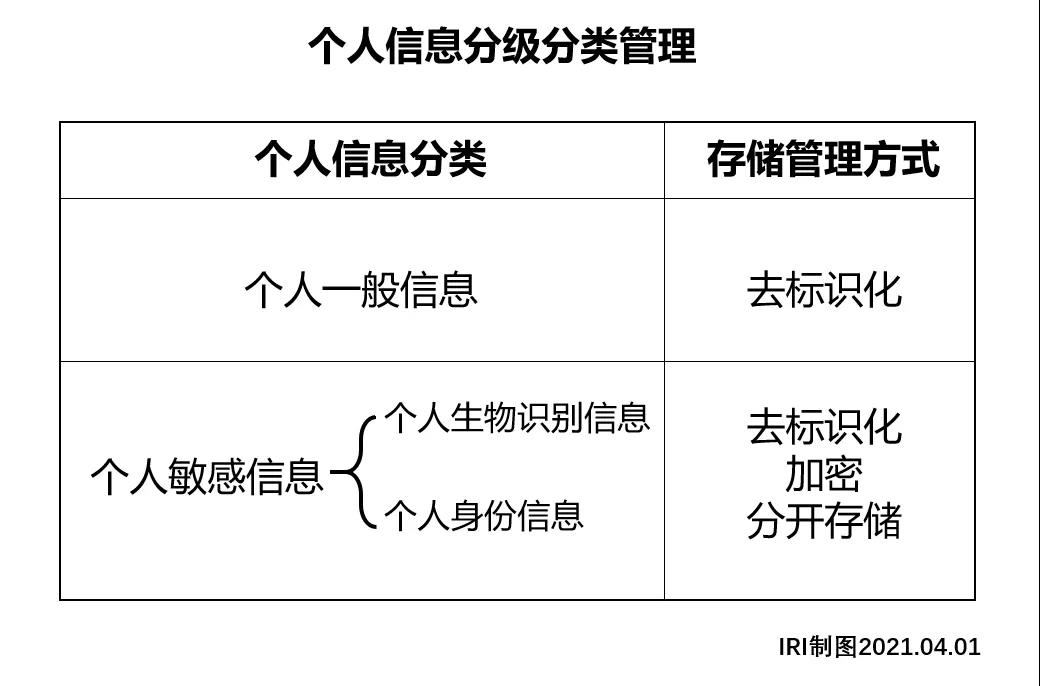要区分个人信息层级,落实分级分类管理。根据《网络安全法》等规定[3],个人信息要区分为个人一般信息(如姓名、性别、电子邮件等)与个人敏感信息(如身份证号、银行账号、住址、通讯录、生物识别信息等),个人敏感信息要区分为个人身份信息与个人生物识别信息(如指纹、掌纹、虹膜等)。另外,对个人敏感信息要采取加密等安全措施,并将其中的个人身份信息与个人生物识别信息分开存储管理。