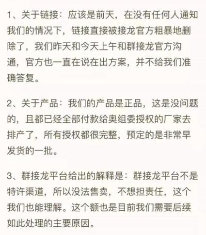 “团长”表示,虽然预售的冰墩墩摆件是向授权厂家订购的正价正品,但群接龙平台并非特许销售渠道,因此被官方下架,其他预售产品暂时不做调整。