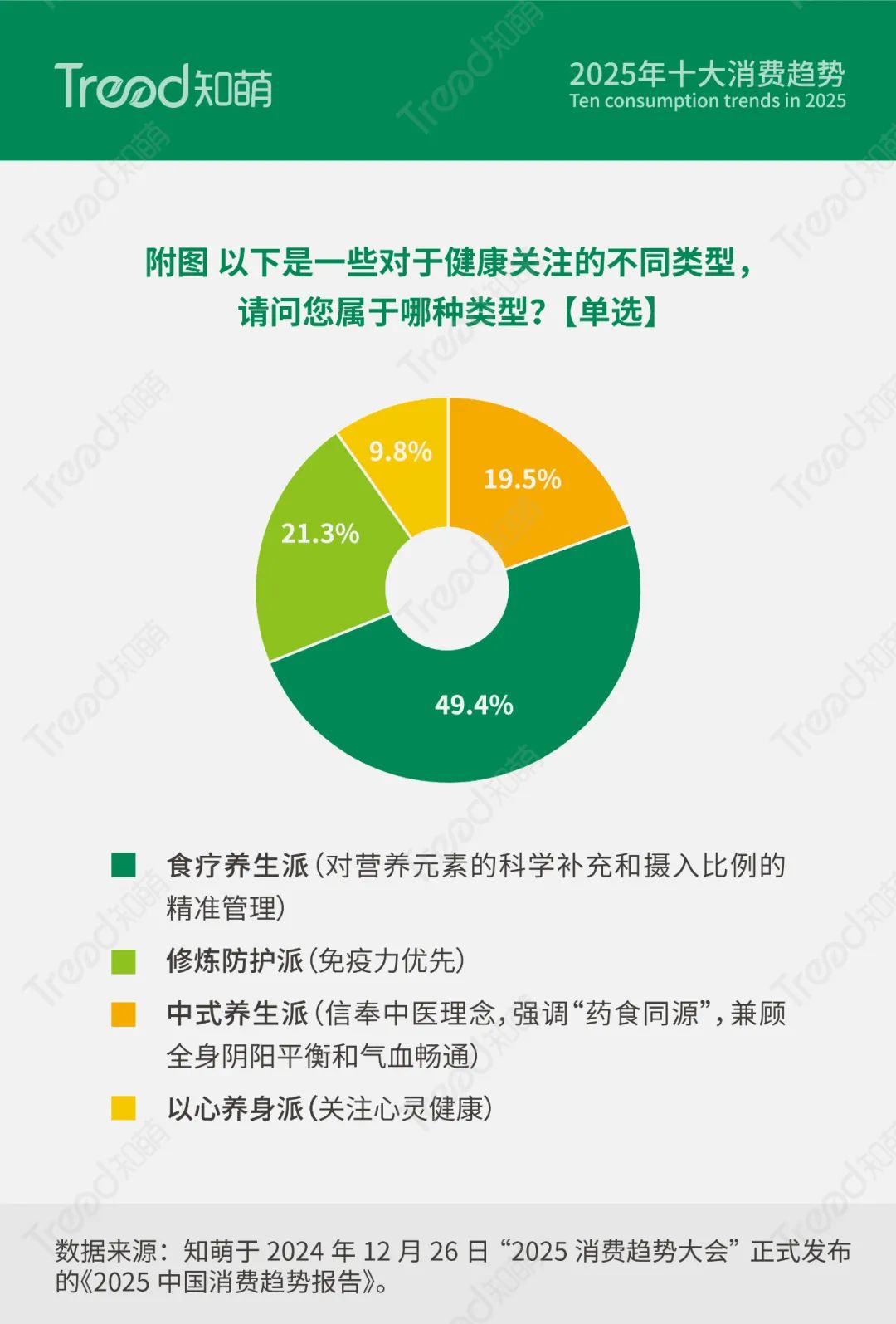 从追求通过饮食改善健康的“食疗养生派”到聚焦提升免疫力的“修炼防护派”,从信赖中意理念的“中式养生派”到关注心灵健康的“以心养生派”,消费者的养生观念正变得更加多元化与个性化。消费者开始从关注外在防护逐步转向内在调理,以实现身体机能的全面平衡与优化。