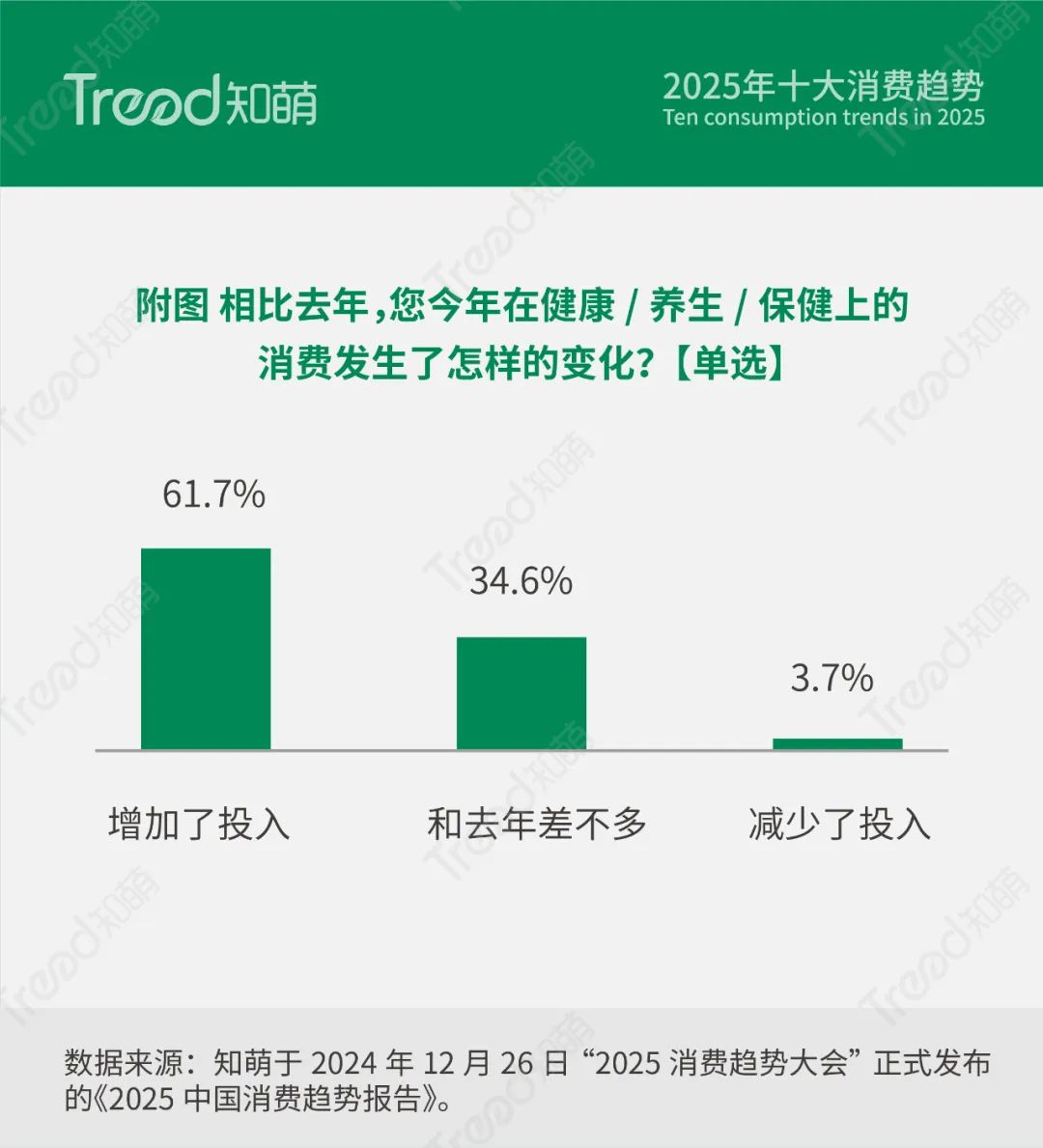 随着健康意识的提升,消费者对健康生活方式的付费意愿增强,知萌趋势调研显示,2024年,超过六成的消费者在健康和养生方面增加了投入。在快节奏的现代社会背景下,消费者愈加关注身体的全面健康与愉悦体验,积极探求身心灵的和谐平衡,致力于将传统养生文化融入现代生活,寻求多样化的养生方法,并期待养生过程充满乐趣和满足感,从而实现健康生活的便捷、高效和愉悦,形成了身心共养的现代养生理念。