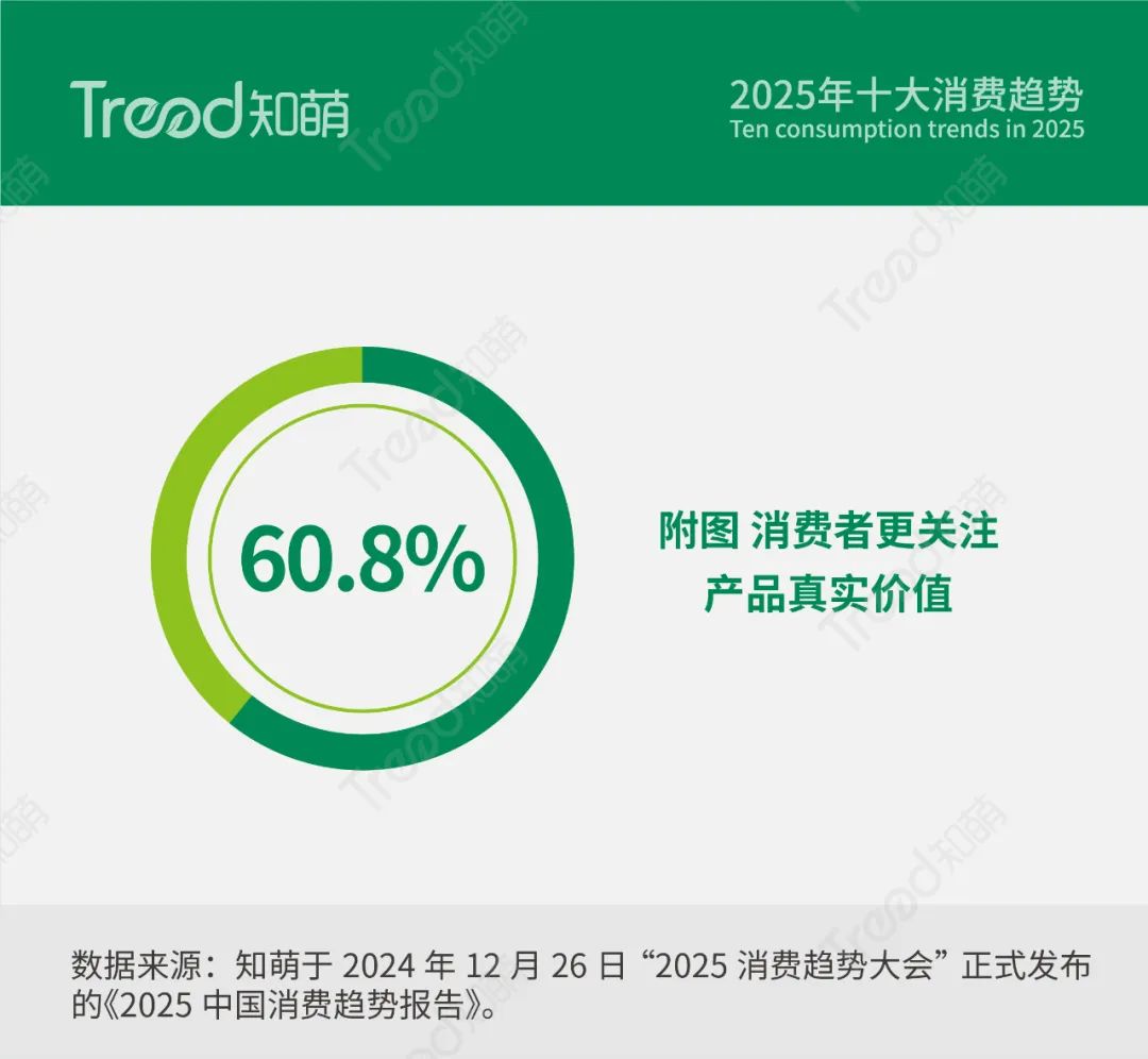 消费者的行为正在经历从感性驱动到理性决策的转变,知萌趋势调研显示,60.8%的消费者更重视产品的真实价值,从细究成分,到关注配料,实际功效才是消费者要的结果。以护肤和日化家清领域为例,消费者不再单纯关注品牌声量,而是将产品的成分表、测评数据、实际反馈视为购买决策的依据。在追求性价比的同时,也更注重产品能否带来可见的效果和持久的价值。