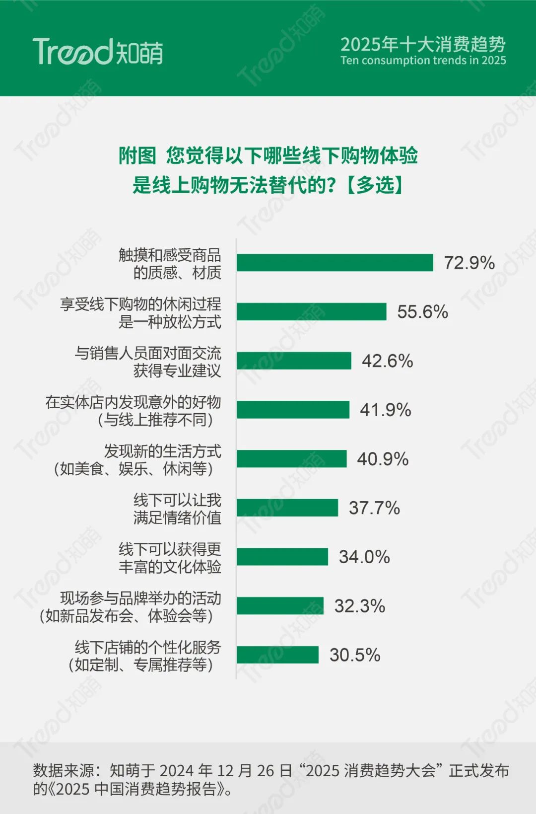 在长期沉浸于虚拟世界后,消费者对现实体验的渴望激增,推动线下消费的回归。2024年,线下消费烟火升腾,越来越多消费者回归线下,线下消费进一步活力凸显。消费者认为,线下体验具有不可替代性,在哪些线下购物体验是线上购物无法替代的问题中,72.9%的消费者选择触摸和感受商品质感材质,55.6%的消费者选择线下购物是放松体验,42.6%的消费者选择面对面交流获得销售人员的专业意见。