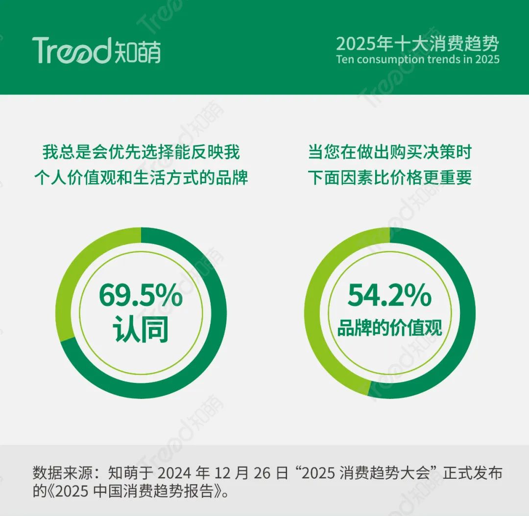品牌不仅是购买决策的参考,更是消费者生活方式和身份认同的重要载体,消费者期望品牌能够成为其身份的延伸。在品牌选择上,消费者不再仅仅关注功能性,而是愈发重视品牌是否能体现其个人价值观和生活方式,知萌趋势调研显示,69.5%的消费者总是会优先选择能反映我个人价值观和生活方式的品牌,54.2%的消费者认为在做出购买决策时品牌价值观比价格更重要。
