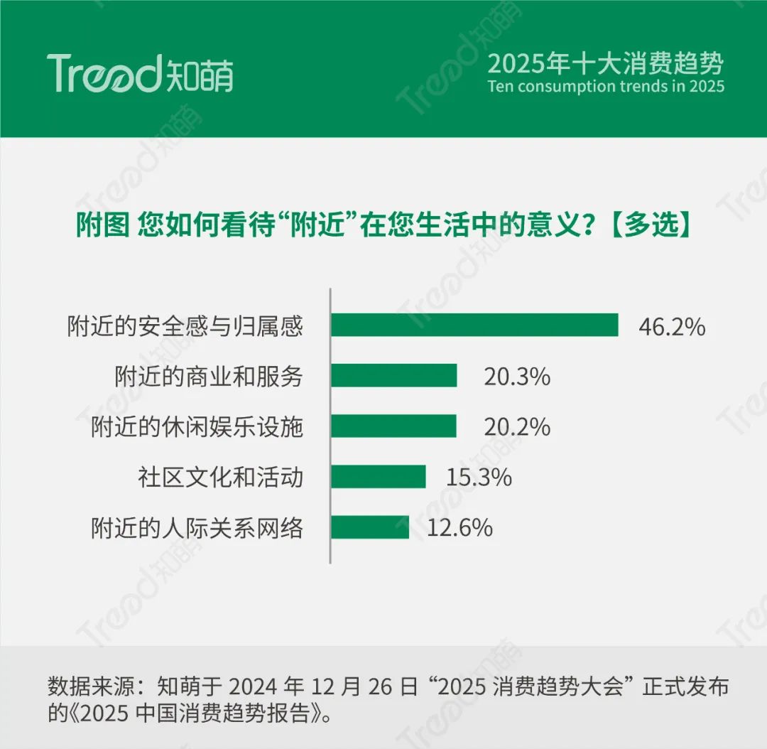 随着现代都市化的推进,人们对于邻里关系的定义逐渐从紧密的人际网络,转变为功能性与灵活性的“轻量化关系”。知萌趋势调研显示,46.2%的消费者将“附近”视为安全感与归属感的主要来源,还有消费者对社区内的商业服务和休闲娱乐设施表现出浓厚兴趣。现代消费者对“附近”的需求不仅局限于情感维系,更注重实际功能和多元体验。这也凸显了消费者希望通过附近的高效服务与便捷生活方式,减少时间成本并增强生活幸福感。