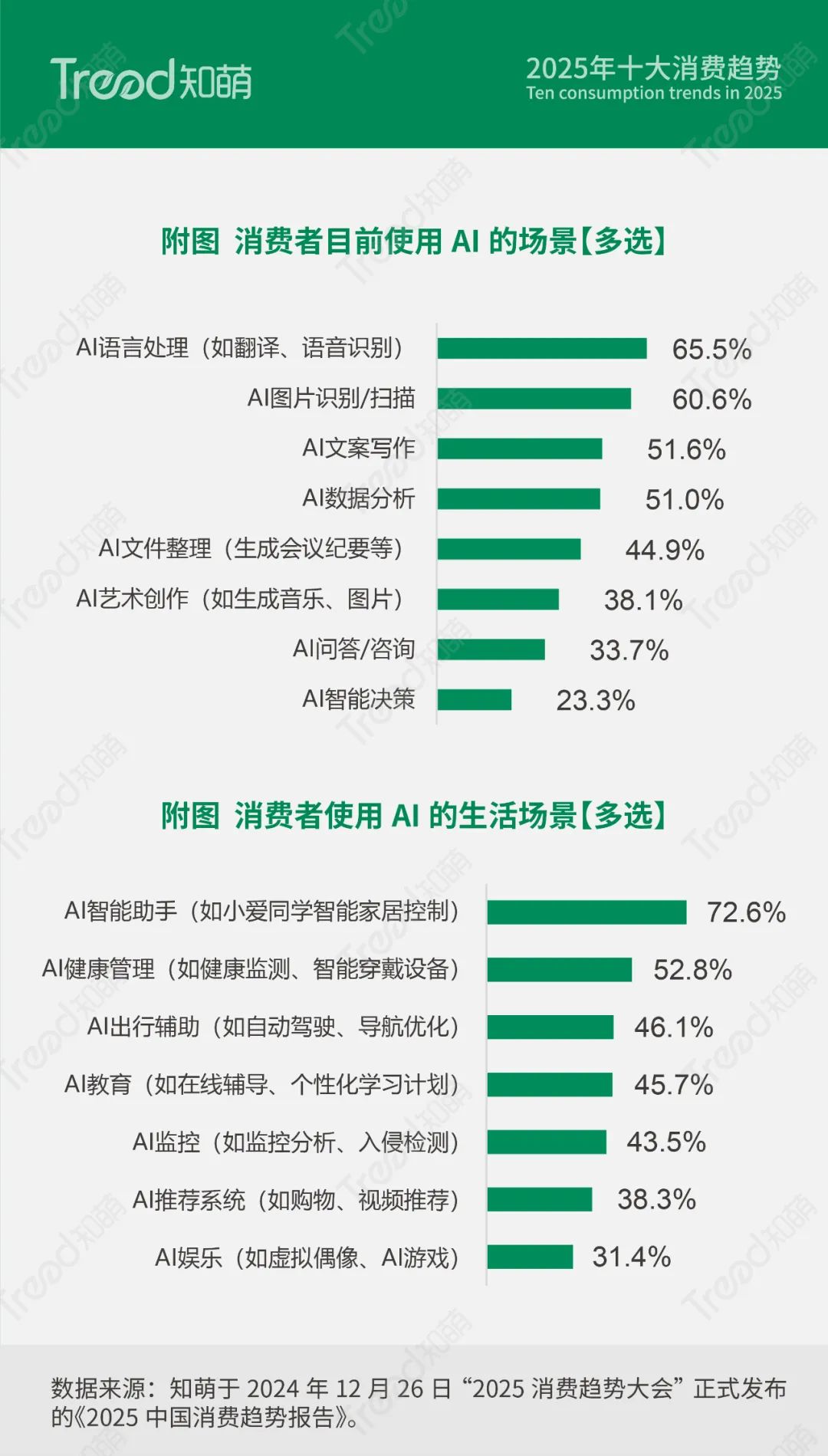 在工作场景中,AI技术正成为个体能力的放大器,帮助消费者突破个人知识和技能的边界,个体展现出“小而强”的组织形态。在生活场景中,AI深入渗透到各个角落,提升人们生活的便捷性与高效性,带来生活新境界。知萌趋势调研显示,65.5%的消费者使用AI的语言处理功能,72.6%的消费者使用AI智能助手进行智能家居控制。