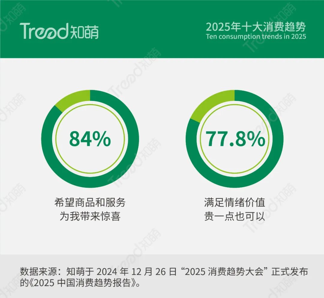 在心界重塑趋势下,消费者更愿意为附着积极情绪的产品买单,知萌趋势调研显示,84%的消费者希望商品和服务为我带来惊喜,77.8%的消费者认为满足情绪价值贵一点也可以。