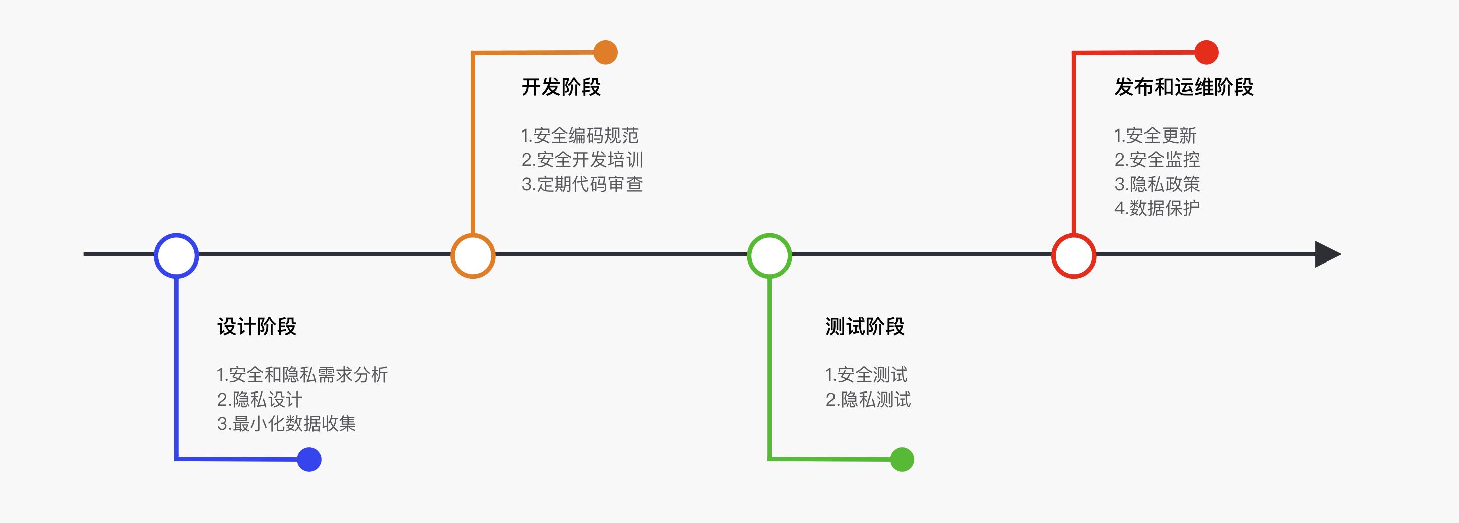 总之在产品设计阶段,应充分考虑安全和隐私需求,明确产品需遵循的法规、标准和最佳实践。将隐私保护作为设计核心,确保产品在默认状态下就能保护用户隐私。同时,最小化数据收集,只收集必要的用户数据,避免收集敏感信息。