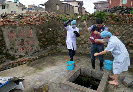 7月12日,在浙江省舟山市定海区临城街道惠民桥村,卫生防疫人员忙着给农户家的水井消毒。摄影/胡社友