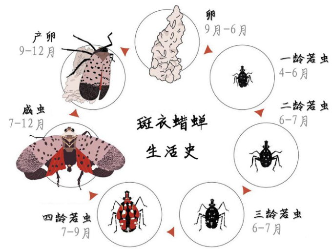 此次记录的斑衣蜡蝉并非美国的本土物种,它原本只分布于我国、越南及印度等东亚国家,近年通过国际贸易被无意引入到其他国家。这次在宾州伯克斯县采集到不少标本,说明斑衣蜡蝉已在当地落地生根数年,形成了稳定种群。Lawrence可能没想到,这竟是一场生态灾难的开端。