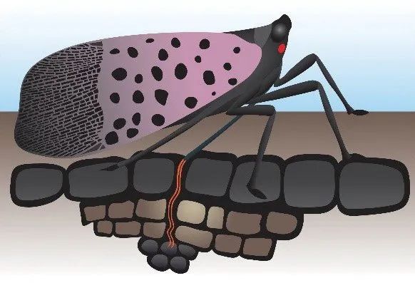 斑衣蜡蝉吸食植物韧皮部汁液示意图