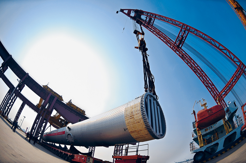 2018年4月28日,世界最重的260万吨/年沸腾床渣油锻焊加氢反应器在江苏镇江制造成功并发运,创造了长江航道有史以来最大重量吊装新纪录。加氢反应器常用于将石油工业中最难利用的重质部分——渣油加氢转化为轻质油,从而生产出汽油、柴油等。这台由国机重型装备集团股份有限公司研制的总长超过70米、重达2400吨的设备,创造了产品重量、制造工艺复杂性两个“世界之最”,是我国油品提质升级项目中的核心装备,成为国家能源保障和美丽中国建设的“国之重器”。图为渣油锻焊加氢反应器正在进行吊装。 新华社记者 李响/摄