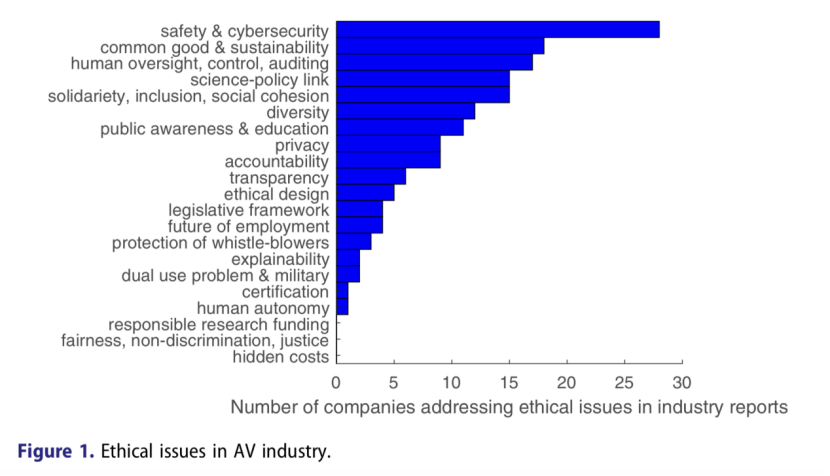 Martinho等人的研究发现“安全和信息保护”是较多公司重视的道德问题;其次是共同利益、可持续性和福祉,人为监督、控制和审计,以及与科学政策间的联系;相较之下,诸如隐性成本、公平公正和非歧视、负责任的研究资助等问题在这些报告中均未提及。