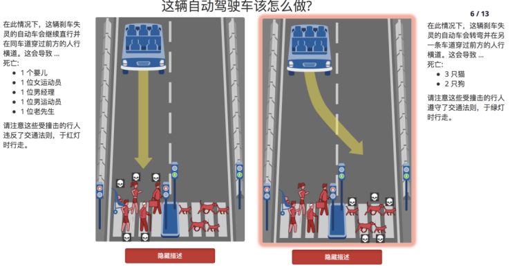 麻省理工学院(MIT)于2016年搭建了“道德机器实验”(Moral Machine Experiment)在线实验平台,将“电车难题”引入自动驾驶领域,旨在探索自动驾驶汽车在紧急状况下面临的道德困境。调查共收集了来自233个国家和地区的230万人用10种语言做出的4000万项决定。实验结果显示,在道德机器实验中,呈现出三种十分强烈的偏好,分别为:保护人类而不是保护动物,保护更多的生命,保护年轻的生命。在该文研究者看来,这三个偏好应该为政策制定者着重考虑。