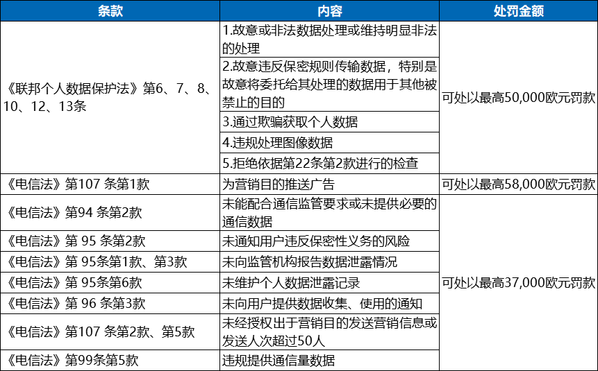 在遵守GDPR罚款规定的前提下,奥地利对于特定违法行为的处罚分为两类:①依据《联邦个人数据保护法》对于5类特定违法行为,处以最高50,000欧元罚款,除非符合GDPR第83条的规定,或根据其他行政法律规定受到更严厉的惩罚;②依据《电信法》对于11类违法行为,处以最高37,000欧元罚款;对于1类违法行为——为营销目的进行广告推送,处以最高58,000欧元罚款。