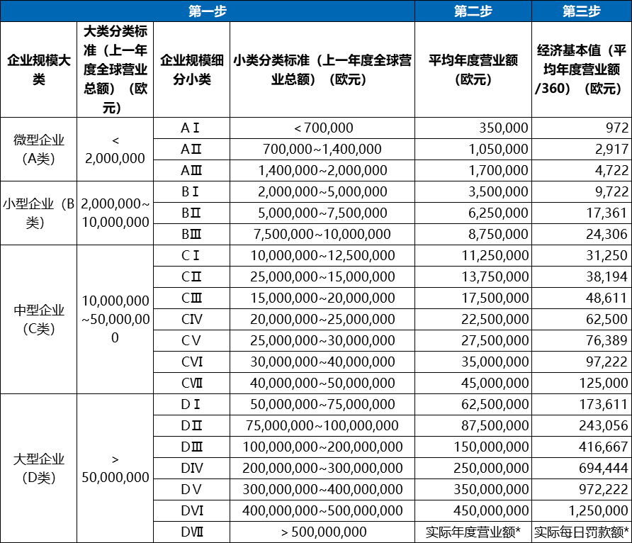 根据企业(集团)上一年度全球营业总额,以“2,000,000欧元、10,000,000欧元、50,000,000欧元”为分界线,可将企业分为微型企业(A类)、小型企业(B类)、中型企业(C类)和大型企业(D类)四类。每种类别下又可细分三到七个小类。