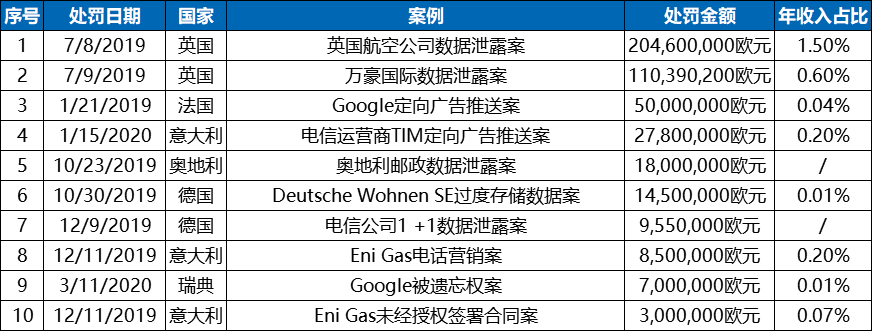 近一年来欧盟国家陆续开出巨额数据保护执法罚单,这些国家包括英国、法国、意大利、奥地利、德国、瑞典等。前十大巨额罚款案例中,处罚金额占被执法企业上一年度收入的比例较低。根据这些案例,可以确定两个主要的被罚款事件类型:一是数据泄露案件;二是营销类案件,包括电话营销与定向广告推送。