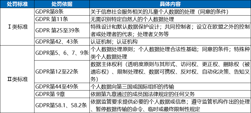 GDPR第83条规定了对企业处以行政罚款的一般条件,并划分了两类处罚标准,分别是:①Ⅰ类标准:对违法企业处以最高10,000,000欧元或上一财经年度全球营业总额2%的行政罚款(以较高者为准);②Ⅱ类标准:对违法企业处以最高20,000,000欧元或上一财经年度全球营业总额4%的行政罚款(以较高者为准)。