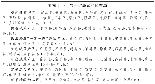 “二环引领”——围绕南昌都市圈和赣州中心城市周边地区优质耕地资源,重点发展城郊农业。其中,南昌都市现代农业发展环为南昌都市圈区域,利用环鄱阳湖区耕地集中、河流湿地水资源优质富集、生物多样性丰富等优势,以稻作体验、灌溉文化、水产经济、渔家风情、候鸟观赏、科普教育发展为特色,发展滨湖休闲农业和乡村旅游。赣州都市现代农业发展环以绿色开敞空间为载体,依托城市周边的大块绿地、水体、田块所构建的生态链,将郊野公园、灌区农场、农家乐、休闲娱乐场地等串联成型,打造都市现代农业链和都市现代农业。